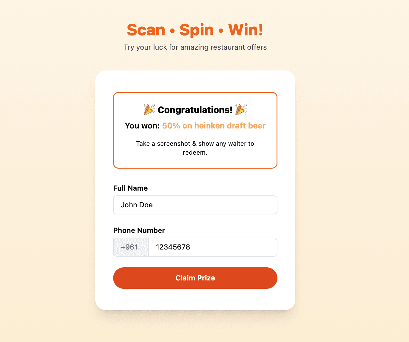 Upon scanning the QR code, the customer is directed to a mobile-friendly web page where they can choose to spin the wheel or skip straight to the menu. If they choose to play, a digital wheel spins and lands on a prize selected based on weighted probabilities. The guest is then prompted to enter their name and phone number to claim the reward, which they can screenshot and show to the restaurant staff. Once completed, they’re automatically redirected to the restaurant's digital menu, ensuring a smooth customer flow.